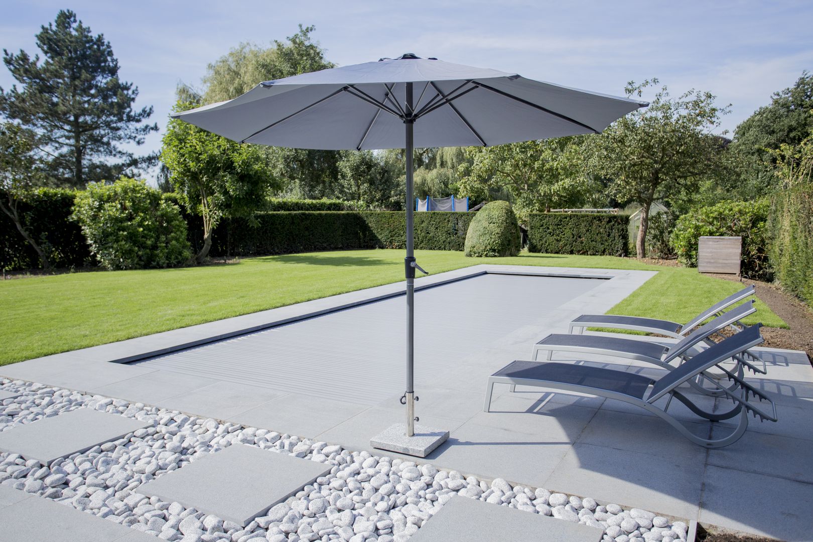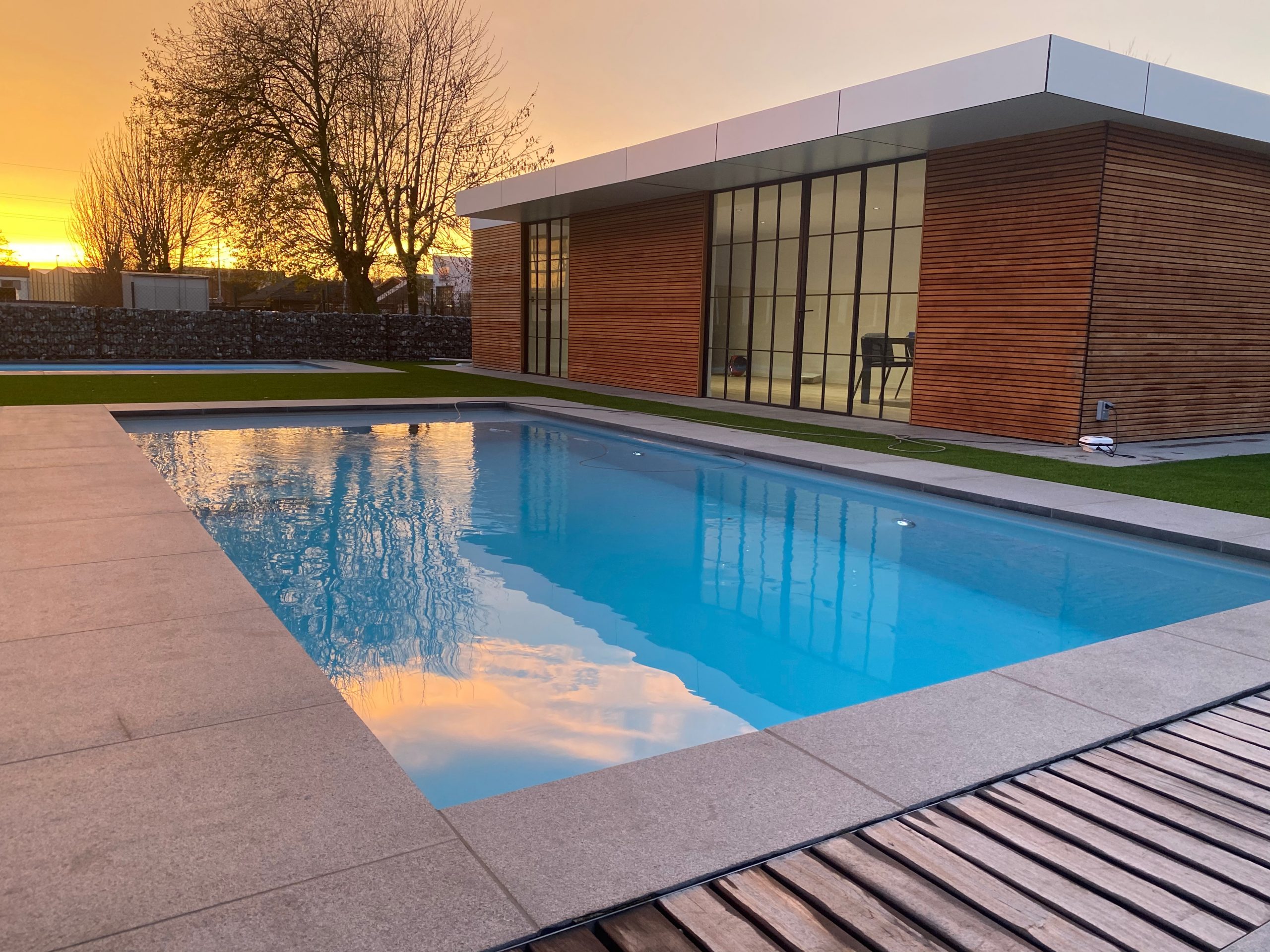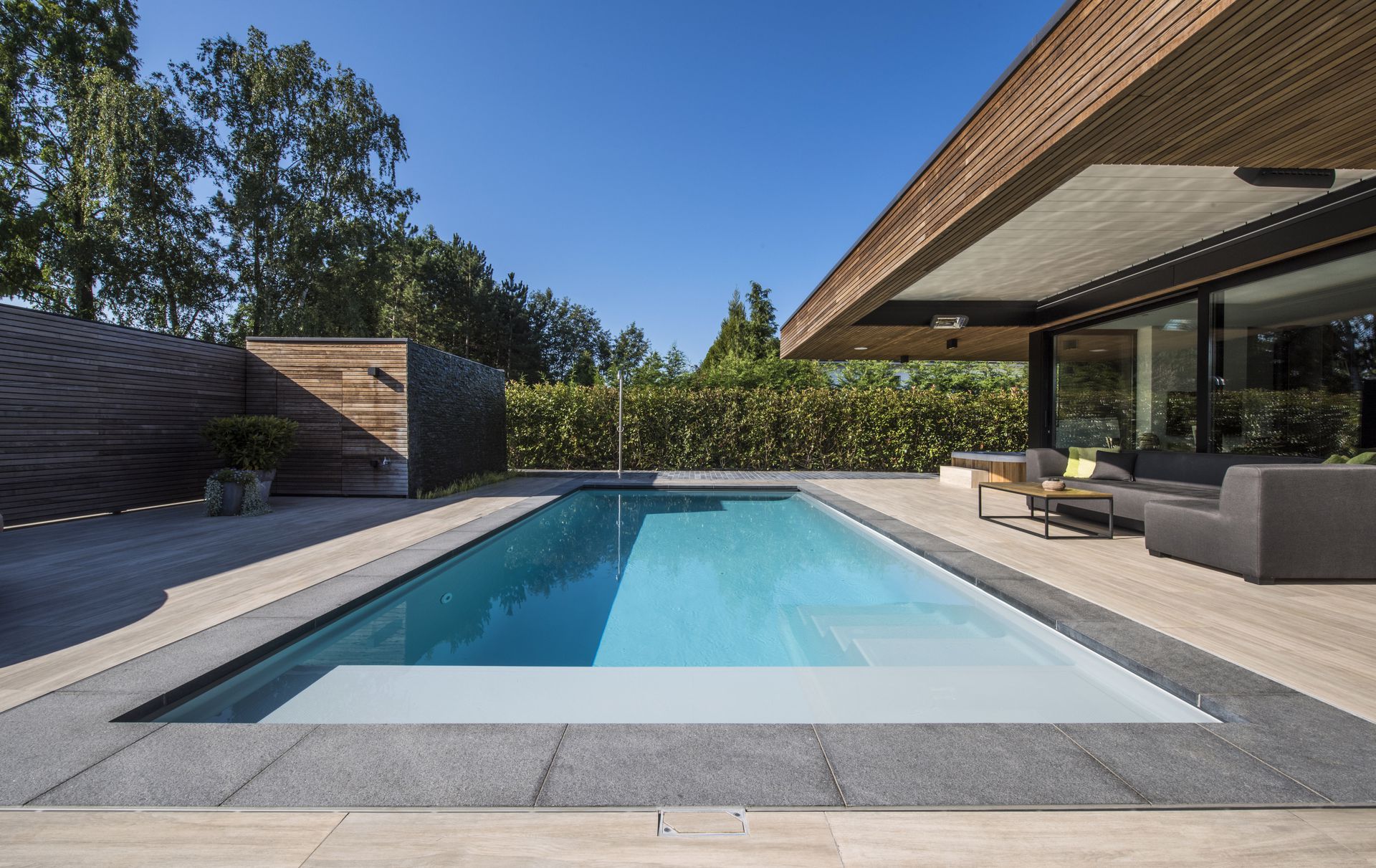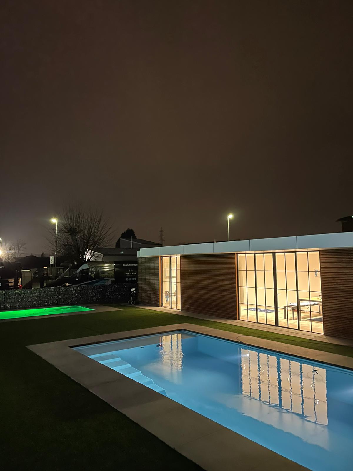 Wij zorgen voor het uitgraven, het volledig grondwerk, het betonwerk, het plaatsen van het zwembad, de installatie van de techniek inclusief circulatie- en warmtepomp, filtersysteem, automatische waterbehandeling, de randtegels en een automatisch zwembadrolluik geïntegreerd in het zwembad.